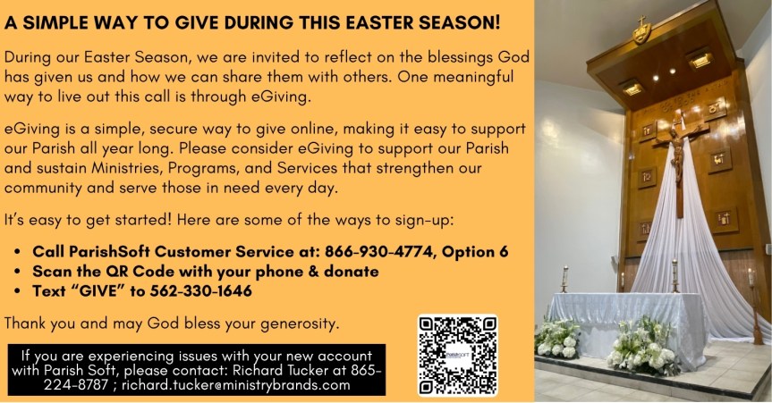 Registration is free to become a Parishioner! To be an “Active” member at our Parish, is to participate in the life of prayer and stewardship. Click here, to take you to our easy sign-up process! Thanks for taking the time to visit our website! God Bless!