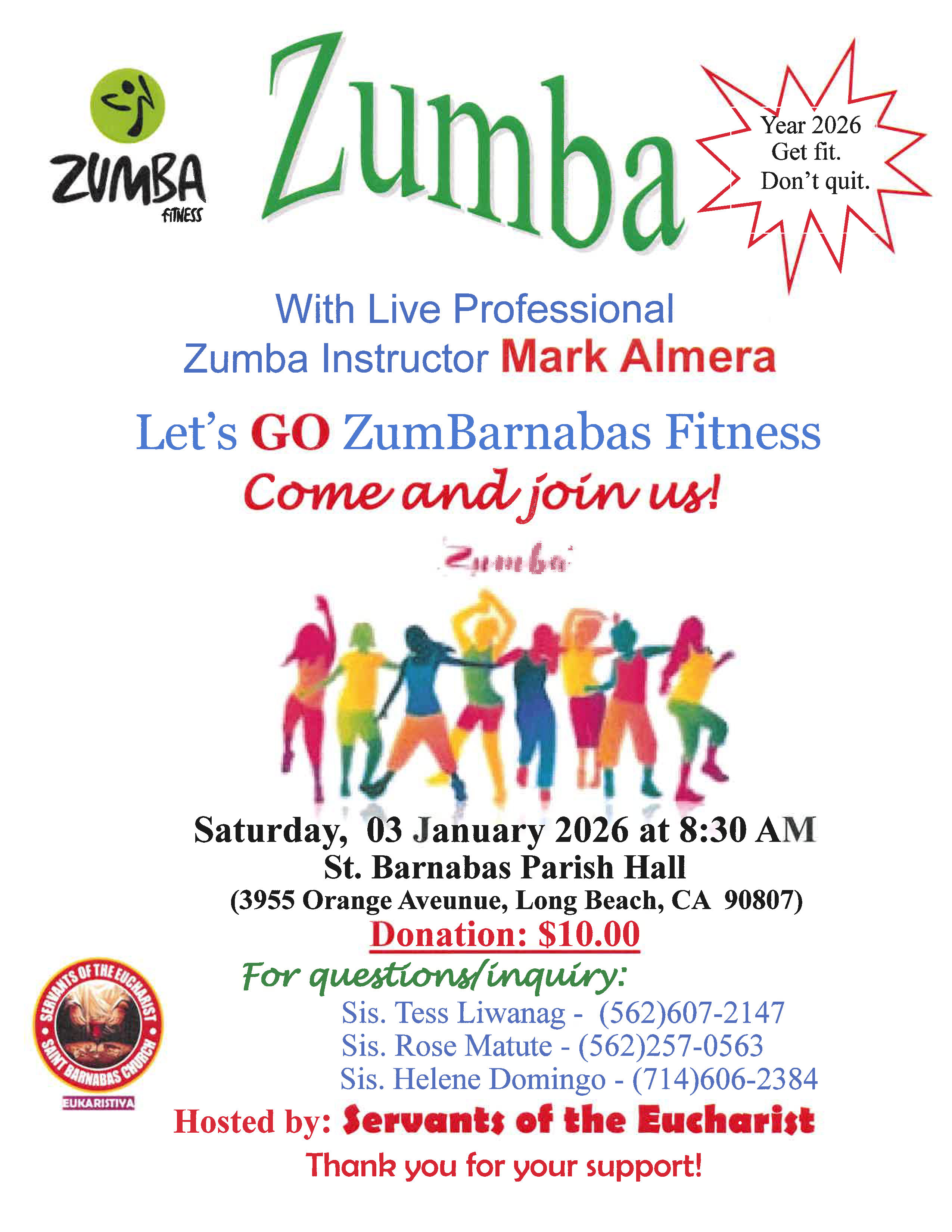 | Jan 3 | ZUMBArnabas Fitness Class *see flyer | Join us for “ZUMBArnabas” Fitness at 8:30am at the Parish Hall. Hosted by: Servants of the Eucharist. Suggested Donation: $10/per person |