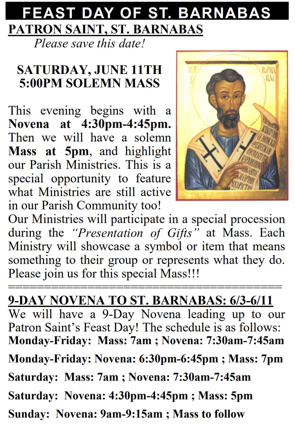 Join us on Saturday, June 11th, 2022, beginning with a Novena to St. Barnabas, from 4:30pm-4:45pm, followed by a Solemn Mass at 5pm. Our Parish Ministries will be showcased with a special procession during the “Presentation of Gifts” at the Mass. Come and partake in our Patron Saint’s Feast Day!