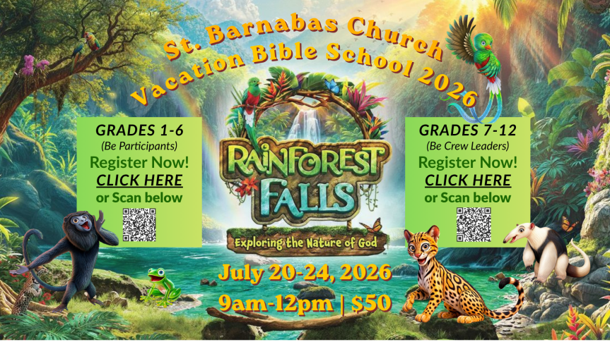 Online payment for Vacation Bible School via Parish Soft (choose “Vacation Bible School”) in the drop-down menu: https://giving.parishsoft.com/app/giving/stbarnabaslb